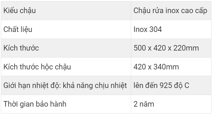 2. Thông số chi tiết chậu rửa bát inox cao cấp S50: