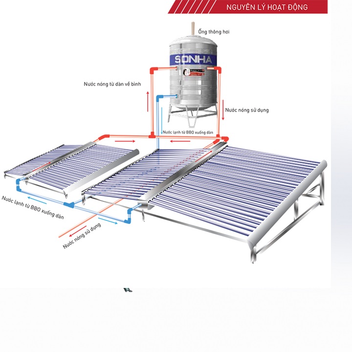 Tận dụng nguồn năng lượng là ánh sáng và ánh nắng của mặt trời chiếu vào bề mặt thu nhiệt của thiết bị đặc biệt (chỉ có ở sản phẩm Thai Duong Nang Sơn Hà) làm cho nước nóng dần lên và được chứa trong bình bảo ôn giữ nhiệt lâu, ruột bình bằng Inox SUS304 (là Inox đạt tiêu chuẩn về an toàn đựng nước ăn của Nhật Bản, Châu Âu)