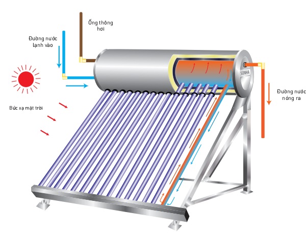 Hệ thống hoạt động theo nguyên lý đối lưu nhiệt tự nhiên, tận dụng khả năng hấp thụ cao năng lượng mặt trời của hệ thống ống chân không. Lớp phủ có độ trong suốt thấp chuyển bức xạ năng lượng mặt trời thành nhiệt năng. Năng lượng mặt trời được hấp thụ tại bề mặt thiết bị sẽ đun nóng nước . Do quá trình đối lưu nhiệt, nước tại bình bảo ôn sẽ tăng lên dần theo thời gian. Quá trình này diễn ra liên tục làm cho nước nóng dần lên cho tới khi hết ánh nắng mặt trời. Nhiệt độ nước trong bình đạt đến nhiệt độ sôi và sẽ được bảo ôn giữ nhiệt độ nóng đến 72 h.